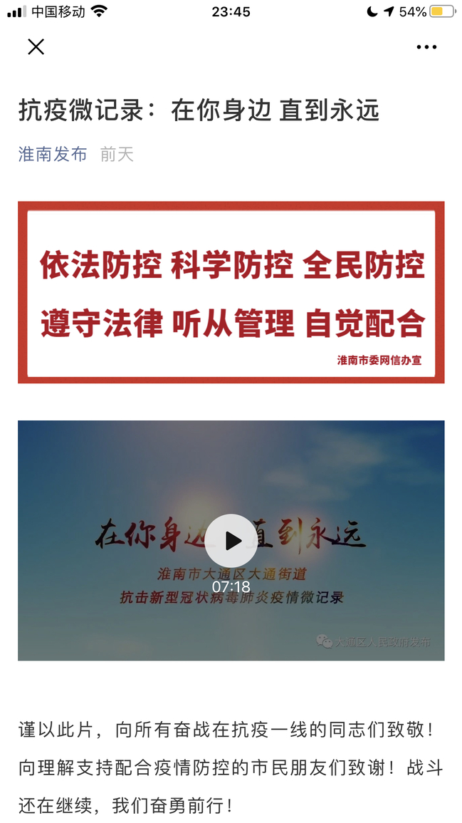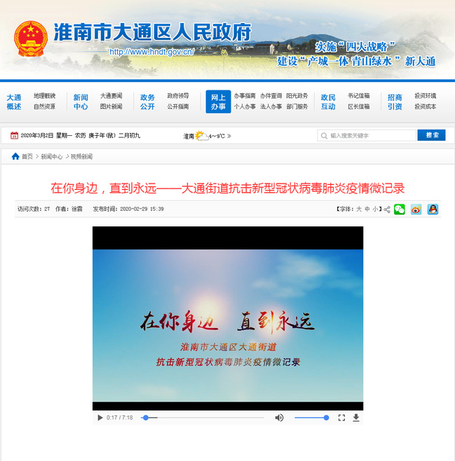 随后,该片由大通区人民政府官网发布,被淮南市人民政府官方微信公众号、中安在线、安徽新媒体集团转载,并由淮南市委组织部报送至安徽省2020年党员教育电视片库。短片一经发出,取得了良好的宣传效果,极大的鼓舞了当地一线工作人员士气,为街道抗击新冠疫情工作留下了宝贵的影像资料。