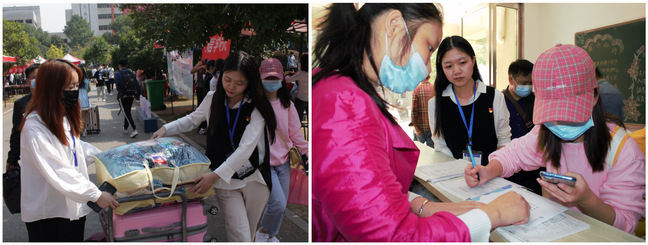 新生辅导员孔婕老师帮助新生搬运行李,办理入住手续