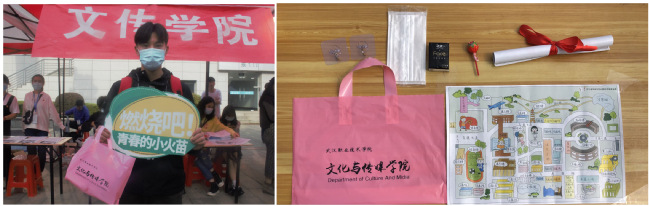 武职网讯(通讯员 余鹏 姚永琛)金秋十月,丹桂飘香,在这个收获的季节里,我校喜迎2020级七千余名大一新生。10月10日—11日,文化与传媒学院2020级新生报到工作在关山校区有序进行。学院迎新工作领导小组联合分团委学生会为全体大一新生精心准备了爱心礼包,分团委学生会结合学院专业特色为2020级新生开设迎新直播间,为新生宣传防疫知识,介绍报到流程,在线答疑解惑,陪伴新生顺利报到。