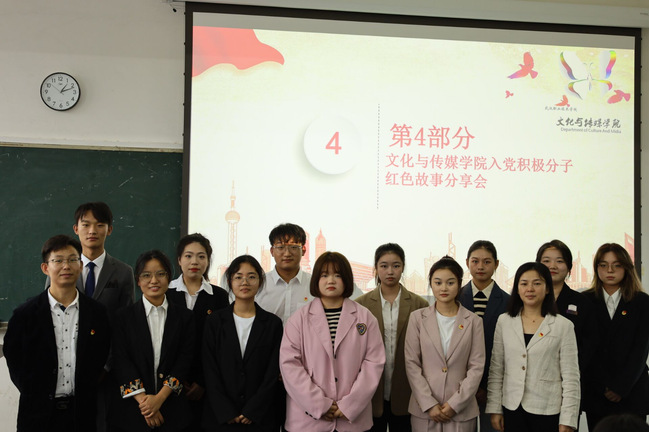 文传学院专职组织员兼分团委书记李丽莉、播主编导学生党支部书记袁满以及部分入党积极分子出席了此次活动,活动由文化与传媒学院第四十四期党校班长沈丹妮主持。