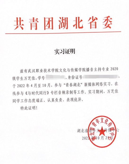 10月,栏目录制工作接近尾声,罗老师也为我们送来一份“礼物”:一张团省委的实习证明。拿着这张凝结了六个月心血的实习证明,我觉得这段历程所付出的一切都是值得的。