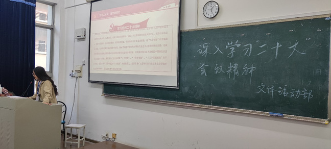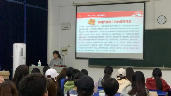 活动中,各团支部通过PPT与视频相结合的方式宣传二十大精神,号召全体学生团员干部要深刻领会习近平总书记“五个牢牢把握”重要要求,全面学习全面把握全面落实党的二十大精神,更加坚定自觉衷心拥护“两个确立”、忠诚践行“两个维护”。