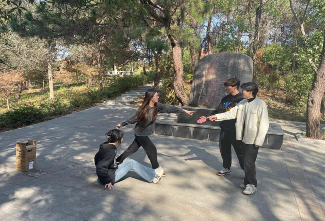 据了解,本次户外课程旨在让学生掌握户外表演空间中的基本技巧,包括定台、走位、调度的设定,道具的运用,台词与表情的训练等。为了让学生在镜头前建立起镜头感、对象感、间距感、走动感,提高空间表现能力,陈慧老师设计了以《公园之中》为命题的小剧目,并在前期指导学生们创作了剧情、撰写了脚本、分配了角色、道具的运用等。