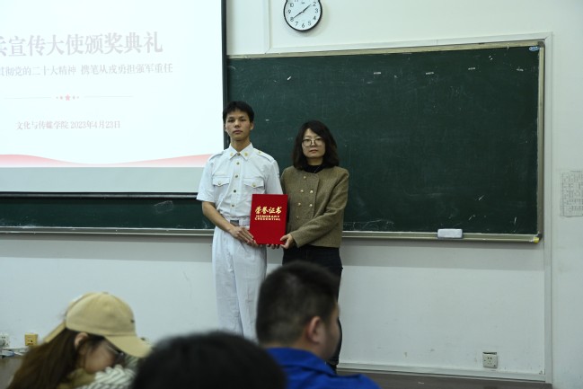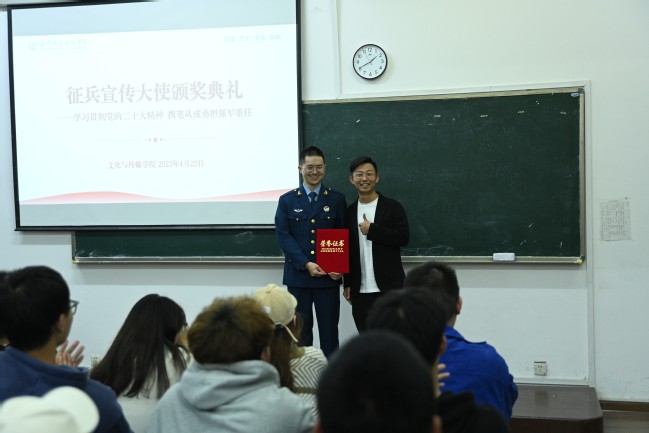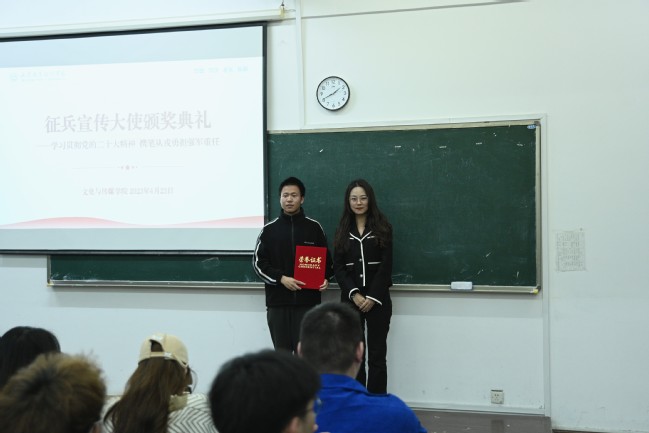 活动尾声,文传学院授予刘国威、陆博强、程林、康升乐4名同学为学院征兵宣传大使,并颁发受聘证书。