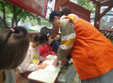 在第二节课上,姚玲老师提议孩子们去社区外的亭子里读书。大家围成一个半圆,孩子、家长和志愿者们交叉着坐。在鸟语花香的环境里,孩子们的读书声显得格外悦耳动听。