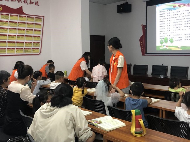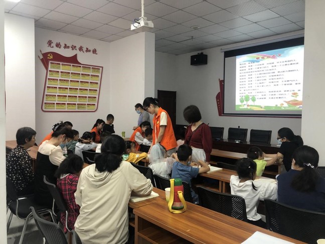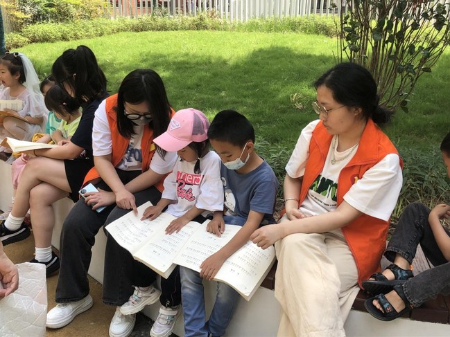 志愿者们还参与社区组织的国学经典课程授课工作。在当天的第一节课上,社区国学课程老师先用班训带入学习气氛中,行“拱手礼”,培养小朋友们尊重知识,尊重书本,尊重老师父母和孔夫子的习惯。随后,志愿者们和老师引导孩子们勇敢发言,帮忙孩子们翻页。