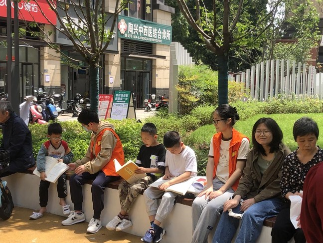 第二节课上,孩子们和志愿者们来到了课堂外,互相交错着坐在花坛边,照看小朋友们。小朋友们争先恐后的举手发言,背书,带领其他孩子一起读国学。