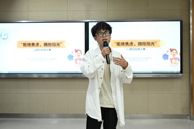 “打开心扉,聆听爱的旋律;追逐梦想,遨游梦的海洋。”随着主持人的话语,活动正式开始。首先,各小组队长上台对各自作品进行先导演讲,同时结合大赛主题分享自己在面对压力时最好的解压方式。接着,大赛进行作品展映。各个小组的短视频主题涉及广泛,分别有外貌焦虑、学业压力、社交问题、自我审视、精神内耗等多个大学生易出现的心理问题的主题。其中作品《救赎》、《破晓》、《微光》以社交焦虑为主题,以较高的立意和较为专业的拍摄角度,展现了面对焦虑和自卑通过自我救赎和集体温暖战胜自己;《破茧》、《各花各有各花香》、《束缚》等作品围绕容貌焦虑,从不同角度告诉大家,怀抱信心和勇气,就可以成为一束属于自己的光;《骄傲的少年》以学业压力为切入点,用一段激情洋溢的奔跑镜头让现场氛围达到高潮。